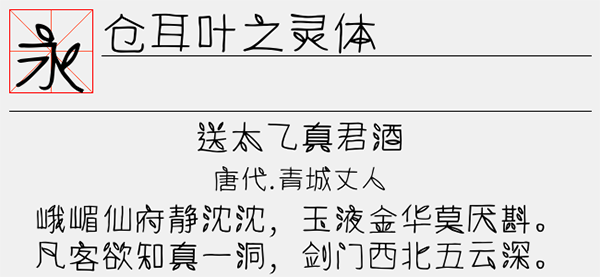 仓耳叶之灵体是一款简单好看的卡通字体,字体当中添加小叶子的符号,字体的风格可爱有趣,简洁的笔画也使得字体拥有很好的阅读效果,仓耳叶之灵体在设计时将小叶子的元素加入到了字体之中,进行设计与创作,给字体增加美观的同时又不会影响字体的使用效果。可以很好的应用于文本装潢、信息展示、网页设计、篆刻制模、数据制作、装潢设计、计算艺术设计、视觉设计、字帖等一切合法应用场景,有喜欢的朋友可免费下载收藏。