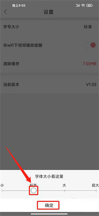 3、进入字体大小看这里界面,拖动滑块到字号下方,点击【确定】,设置字号大小。
