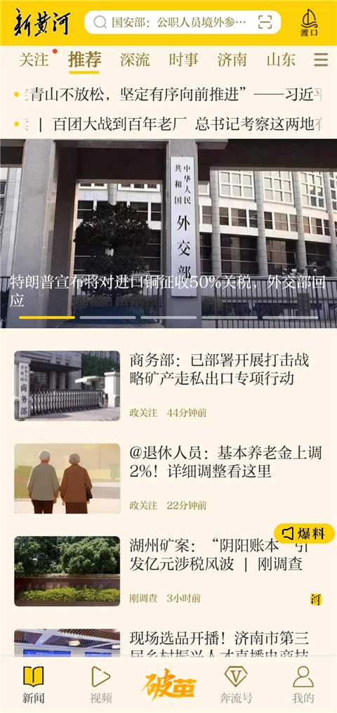 1、【千篇一律?拒绝!】 首家引入火山引擎大数据推荐算法的原创新闻媒体资讯平台。深度调查、社会热点、生活趣闻、明星八卦、体育花边……通过对您浏览内容、阅读习惯、关注的领域和话题等的智能分析,在海量资讯里快速筛选最有价值的信息,为您呈现一个更想要、更个性、更喜欢的资讯世界。 2、【喧嚣浮躁?严肃!】 热点事件频繁更迭,各路观点蜂拥而上。新黄河不蹭无脑热点,不玩花式套路。我们专注深刻洞察、大浪淘沙,第一时间带给你真实、有深度的热点事件解读。 3、【海量视频?有料!】 最热门、最治愈、最精彩的短视频,让您笑出腹肌也可瞬间哭爆;还有现场直播,随时带您直击第一现场。 4、【信息太多?定位!】 覆盖全国信息网格,打开定位,新黄河就能根据您所在位置、区域,智能推荐该区域及周边的相关新闻资讯和实用的社区生活服务信息。 5、【大咖观点?网罗!】 众多政务、媒体、个人号入驻,覆盖体育、财经、科技、娱乐、教育、政务,任您订阅。新黄河app功能