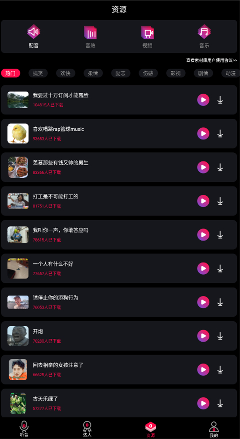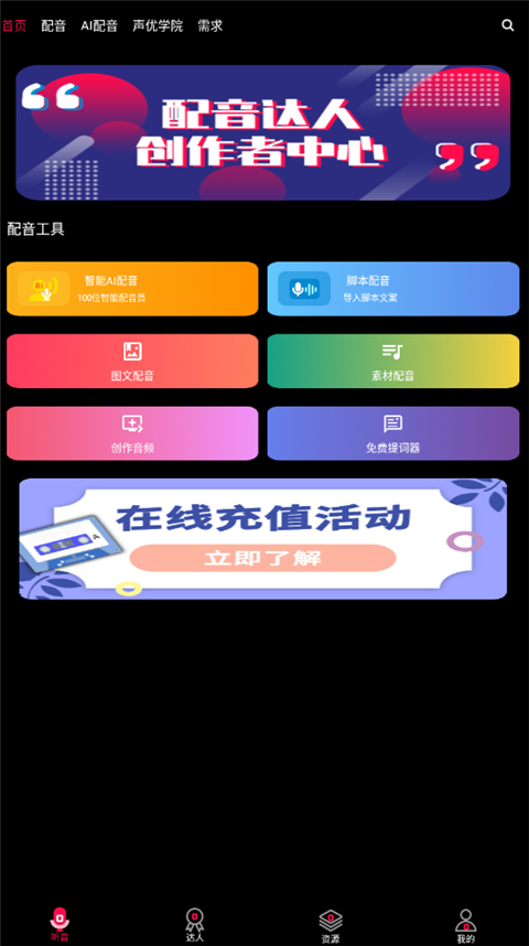【配音达人】众多配音大咖和达人来入驻,助力视频制作。你的视频想有《舌尖上中国》的声音效果吗?想有周星驰的配音感觉吗?那么一起来学习配音吧。 【万千素材】软件配有配音、音效、视频、音乐四大类素材;搞笑、欢快、柔情、伤感、励志、震撼磅礴等64个小分类素材大集合。让未来素材将扩展到10万+以上,成为手机制作视频配音的素材和首选灵感来源。 【智能配音】采用国际领先的配音模块,输入文字即可转换成语音,还可以转换成地方语言,用个广东话、湖南话来配音也不错哦! 【声优学院】邀请国内配音讲师,因人施教,制定教学策略,培养一线播音员、配音员,声优主播,优秀学院对接签约国内一线MCN机构,网红定制打造。 【真人配音】我们邀请了数百位配音员、从事配音工作数十年的老师加入配音达人。来满足您各类高品质的配音需求。未来还将开通德语配音、英语配音、法语配音、意大利语、俄语、西班牙语、越南语、日语、韩语等世界各类语言配音。 【需求定制】依据内容属性,可以即时找配音达人定制,交易全开放,平台全免费。 【内容发布】提供优秀的配音内容展现平台,给优秀配音内容展现量,优质配音内容平台推荐给抖音、快手、B站等优秀视频平台;优秀达人签约网红经纪公司。 【内容交易】你的配音视频在线交易,原创内容交易平台。配音达人app使用教程