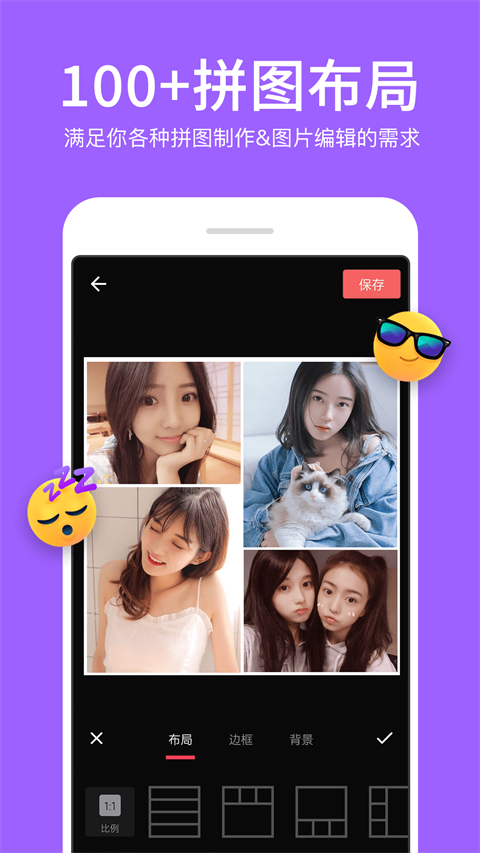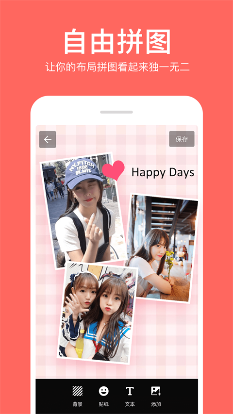 - 从图库快速选图,最多支持18张 - 选择不同的布局和模板以及自由瓶贴 - 添加滤镜,贴纸,文字,涂鸦和其他效果 - 旋转,翻转,缩放,长按拖动交换图片,非常易于操作 - 添加不同背景色和其他设计效果,自定义背景图 - 选择照片比例,例如:1:1, 3:4, 5:4, 9:16等 - 保存分享作品到朋友圈软件特色