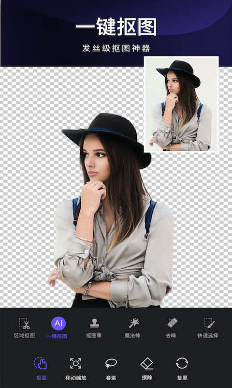 1、抠图:选定区域,轻松几笔勾勒出你想要抠出的部分,就可以把物体或任务自动抠出来; 2、导入背景图片合成:内置20种精美背景图库,让你的抠图丰富多彩,你可以通过拍照或选取相册图片自定义添加背景图片; 3、移动、旋转、缩放:移动、旋转、缩放抠图,照片合成和灵活; 4、橡皮擦:想要清除已抠出来的照片中某一个部分,橡皮擦帮你轻松解决; 5、滤镜:内置高颜值滤镜效果,给你的图片锦上添花; 6、保存及分享:保存合成的图片到手机相册或分享到任意APP,非常方便。更新日志
