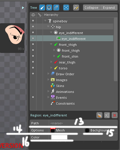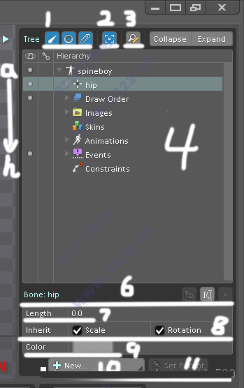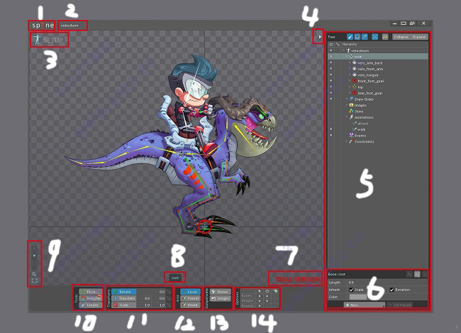 PS:由于是全英文,所以这里简单的翻译和解释下主界面的相应功能 一、装配模式功能区 1.主菜单:点击这里会弹出Spine的主菜单,按地球文明的习惯,一般:打开、保存、新建、导出、导入、系统设置,之类的功能都放在这里 2.项目名称:当前项目的文件名显示在这 3.当前模式:【ctrl + tab】在Spine的装配模式、动画模式间切换 4.层级树窗口按钮:【ctrl + T】点击展开和关闭层级窗口,拖拽调整窗口大小 5.层级树窗口:以树型结构显示的大纲目录,项目中所有的对象都在这里,相当于Windows资源管理器左边的导航窗格 6.功能区:它是层级窗口底部的扩展面板,类似于PS上方的选项栏,会根据所选内容变化。节点的:新建、删除、复制、重命名、更改层级、修改属性等大多数操作都在这里。自已分别选择一下各种节点,看看效果吧。 7.试用版:这个只有在试用版显示,意思就是告诉你这是试用版。如果你看到这个就不要再问,为什么我不能导出,为什么我不能保存这一类的问题 8.当前对象:当前选中对象的名称。如果选中多个对象就只显示数量。 9.视图缩放控制:【ctrl + F, ctrl + shift + F, ctrl + shift + alt + F】就是放大缩小场景中的对象,以方便显示嘛,那几个图标都点一下,看看效果吧 10.工具:这个面板就叫工具,从上到下分别是IK【B】,权重【G】,创建骨骼【N】。(要说明的是这个Pose和右边层级目录中的Constraints别搞混了,其实在别的软件中,这两个东西是合在一起的叫作IK,在这给拆成两半了) 11.变换工具:这里就是旋转、位移、缩放了,右边的小钥匙就是K帧按钮。绿色表示值无变化,黄色表示改变了值,但未创建关键帧,红色表示已经改变了值并创建了关键帧 12.坐标系:当前,父级,世界。这个就不解释了,不明白的就google吧 13.抵消变换:主要的用途就是旋转、位移、缩放父对象时,保持它的子对象不动 14.选项:这里是分别针对骨骼、图片、边界框的是否可选、是否显示的控制开关