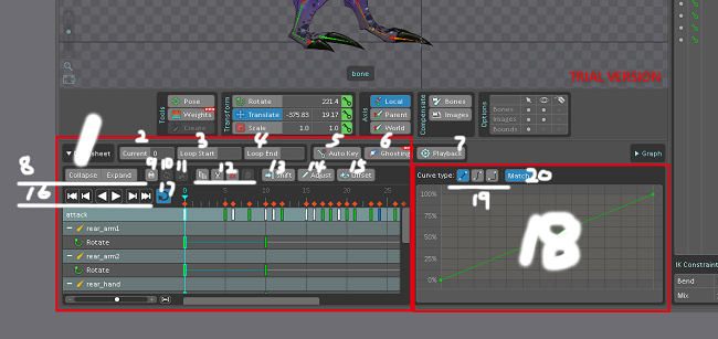 18.曲线编辑器:本来这里才应该是动画师的主战场。不过Spine中,曲线编辑器只算是个配角了。只能显示两帧之间的过度。