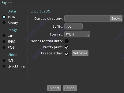 Spine 能将项目中的动画导出为 JSON 或二进制格式文件,它们能在 Spine 运行时库中完美的再现。 Spine 同时还可以导出 GIF 动画, PNG 或 JPG 序列图,还有 AVI或 QuickTime 的视频文件。