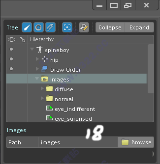 d)图片路径:这里显示硬盘上的图片资源。Spine只是从路径引用图片,并没有把文件导进项目。只是原封不动的显示硬盘上文件夹的内容。