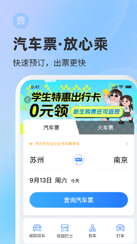 【汽车票】 随时随地预订汽车票,无需排队,支持扫码直接上车; 部分地区支持在线退票、汽车票改签,出行更无忧; 支持国内3000个汽车站20多万条客运线路在线预订,线路覆盖全国各大城市及机场; 支持线下直接取票,300多台取票机已覆盖国内110个客运站; 支持流水班等特殊班次在线预订,部分城市支持购买携童票、儿童票等特殊票种; 支持提前60天预约购买车票; 支持首单立减、优惠券等优惠。 【火车票】 全国火车票随心预订,出行更便捷; 支持学生票,儿童票,方案更全面; 全新极速云抢票、上车补票,抢票快人一步; 提供退改签及私人订制服务,体验更优秀,部分地区火车票支持电子票,无需邮寄,一键出票。 【机票】 支持国内航班在线预订,价格透明放心消费; 航班动态实时看,行程有变动,在线退改签,7*24小时售后服务有保障; 提供全额行程单,报销更无忧,机场交通、服务信息一站式查询,机场巴士等服务巴士管家手机客户端全搞定。 【机场接送】 往返机场,快车、拼车、包车、机场大巴自由选择; 一键对比价格,可靠放心。 【城际快线】 跨城接送,商务小车; 比大巴更舒适,比快车更便宜,比顺风车更安全。 【城际拼车】 上门接送,拼车人数可控; 同行乘客智能推荐,一站式服务更贴心。 【包车】 单趟包车、机场接送、往返包车、按天包车,5座轿车到53座大巴丰富车型任您选择。 专业驾驶员,提供优质服务。 车辆严格把关,保证乘坐舒适。 【酒店】 订车站、学校附近的酒店宾馆住宿,方便快捷; 提供国内600000余家酒店、客栈、酒店式公寓的在线预订服务; 7x24小时全天服务,到店无房,承诺赔付首晚房费,预订更安心。 【打车】 多平台呼叫,智能比价,打车更快更省。 巴士管家优选专车、曹操出行、首汽约车、T3出行、享道出行等多品牌集合,覆盖215个城市,满足各类出行需求。 设置紧急联系人,行程分享,安全有保障,出行更舒心。 【公交地铁】 公交到站实时查询,智能推荐附近站点; 往返路线一键转换,营运时间一目了然,更有36城地铁线路可供查询,让出行省时、省心; 【定制巴士】一人一座,轻松上下班。 【校园巴士】拉近校园和家的距离,来去更自如。 【社区】巴士管家社区开业啦 每日精选话题PK,大胆说出你的观点。参与互动,旅途不无聊总有新鲜事; 小巴出品自制短视频,【小巴真人剧】逗你乐开怀;【小巴看世界】跟着镜头带你领略各地风景名胜。常见问题