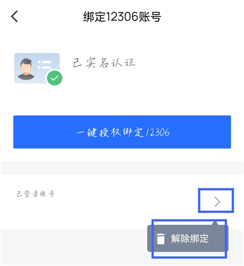 4、在【在已登录账号】处,点击>标识,点击【解除绑定】即可。