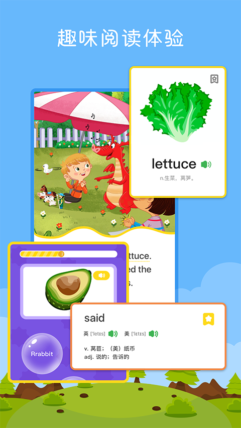 【海量优质内容】 海外原版原声绘本、图片精美、屡获殊荣 【趣味阅读体验】 打造听、说、读、单词四位一体的学习场景 【每日个性推荐】 根据你的水平,定制每日专属阅读内容软件亮点