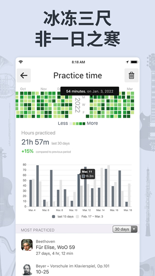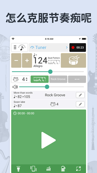 开始/停止节拍器 设置声音/闪光灯/振动/可视节拍的组合 打开调音器 记录您的演奏 选择节奏模式 使用黑屏电池节能模式软件优势