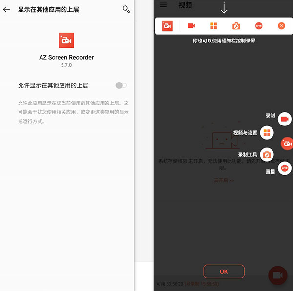 2、我们打开AZ屏幕录制,在下拉通知栏中可以看到软件的操作界面。