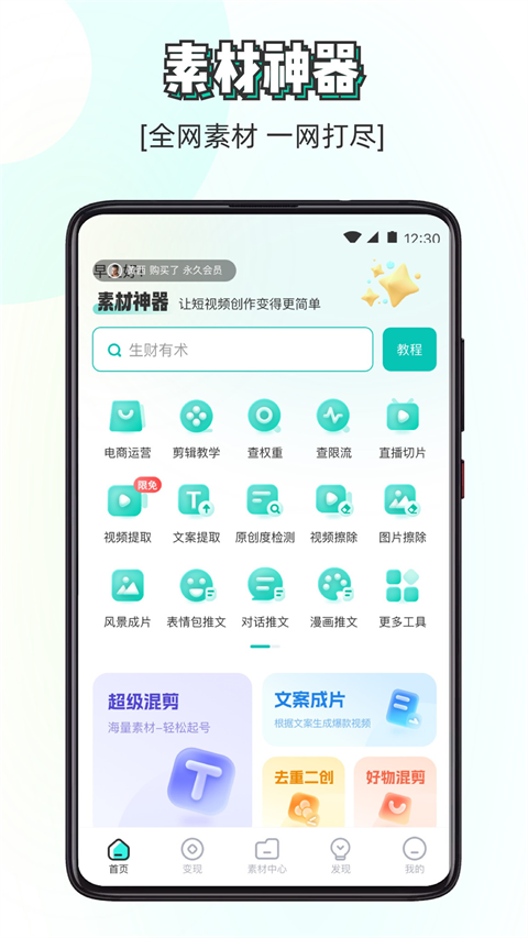 【素材大全】 无论你想要绿幕素材,搞笑素材还是风景素材,都可以一键获取,20w+海量素材:—键搜索全网素材,,随时下载到手机本地,一键下载保存本地就可以二次剪辑生成个人专属的视频。各种风格类型的短视频文案素材,图片声音素材一应俱全,应有尽有。 【创作工具】 视频提取文案、违禁词检测、提词器、数据监控、账号诊断、账号估价、视频镜像、MD5修改、图片转文字、语音转文字、长图拼接及抖音权重查询工具等。 【合同模板】 海量合同协议模板大全,常用电子合同模板文档库,一键下载自定议编辑。 【精选教程】 流量变现指南,直播销售策略,拍摄剪辑运营教程,博主养成攻略,引流推广教学,电商教学,全平台自媒体运营,主播带货进阶培训等海量运营系列课程,全套运营方案,超多实战干货 【文案素材】 5000+唯美文案:在文案工具中,用户通过在搜索栏输入想要的关键词,即可获得大量热点文案 【高清素材包】 每日更新高清素材包:唯美系、治愈系、搞笑系列、经典转场、绿幕特效、美剧复联系列,高清无水印素材包热门素材一键获取。素材神器app如何获取抖音视频