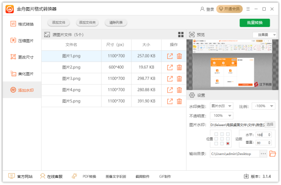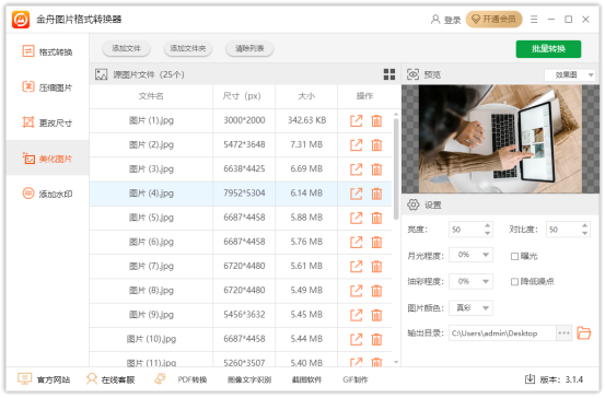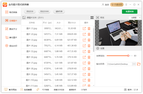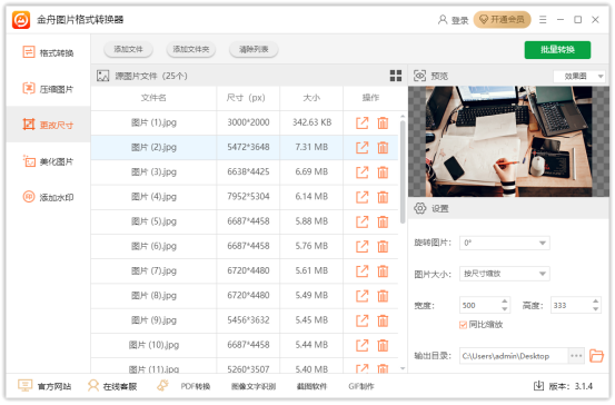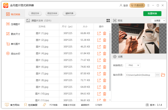 金舟图片格式转换器官方版是一款功能全面且实用的图片处理软件,支持图片一键批量处理,拥有效果预览、图片格式转换、图片压缩、美化图片、添加水印等功能,可大幅提升高效工作效率。