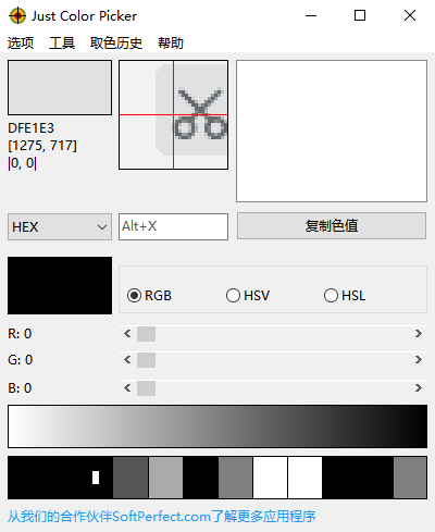 Just Color Picker是一款桌面屏幕颜色提取工具,主要用于获取屏幕上任何颜色的RGB值或十六进制值,并支持将颜色复制到剪贴板、保存到文本文件或直接输出到命令行。无论是平面设计师,数字艺术家还是网页设计师都离不开对颜色的追求,为了方便大家对颜色的提取,特意推荐这款Just Color Picker给大家,把鼠标放到任意一个地方,Just Color Picker会告诉你颜色代码。