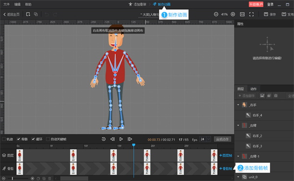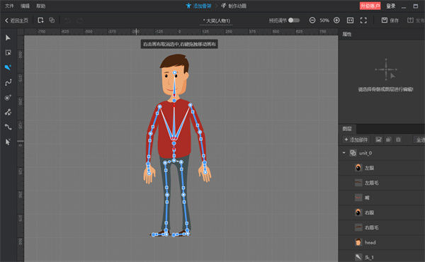 万彩骨骼大师是一款专注于2D角色的骨骼动画制作软件,可以帮助用户更好的制作角色,添加骨骼让图片看起来更加生动,可以用最简单的方便让图片动起来,且不会觉得生硬,方便实用。软件使用简单,非常容易上手,用户直接拖拽角色图片或点击添加按钮,就可以将您需要生成动画的角色加载到设计界面,需要注意的是所有角色图片必须是PNG透明图片,随后可以在软件添加骨架,可以对动画内容变化,结合软件的动画制作功能,就可以在时间轴界面设计动画帧以及添加动作。