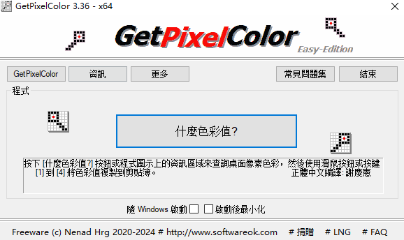这个功能也可以用更复杂的程序来实现,但不是每个人都可以在个人电脑上进行各种设置来实现简单但有用的功能。即使作为一个电脑初学者,你也可以使用这个免费程序来确定正确的像素颜色,直接从程序或窗口任务栏的通知区域使用鼠标。当鼠标按钮被按下,调色板出现或者用1到4键直接移动到剪贴板/保存时,像素被确定。
