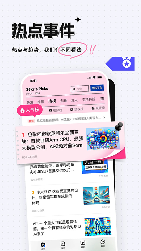 1、【传递价值资讯】 一手新闻、深度报告,好奇心患者、专业大咖都对味。 2、【7 x 24 h 快讯】 资讯不间断更新,创投圈大事小情你先知道。 3、【关注兴趣话题】 订阅感兴趣的标签,只为更专注的阅读。 4、【发现更多精彩】 精品栏目、热门标签,就连本周最棒的10篇文章都为你选好啦。更新日志
