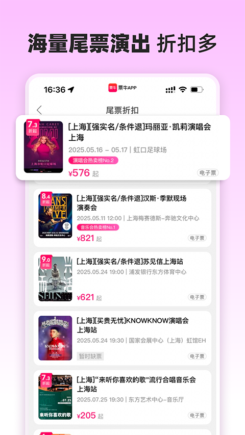 1、折扣票 每天都有不同折扣票大放送 2、热销票 保证票源,确保票品真实 3、闲置票 随时随地轻松转出手中闲置票 4、精彩活动 票牛每月定期放出不同形式优惠活动,近期折扣演出、1元抢购、周杰伦、陈奕迅、五月天演唱会稀缺门票抢购票牛卖点