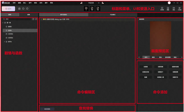 次元工坊PC端是一款支持模型演出,用于制作互动阅读作品的制作工具,也叫易次元编辑器,主要为易次元平台创造者提供更快捷的编辑平台,在次元工坊中,制作者同样是通过在命令编辑区编辑命令来制作作品。