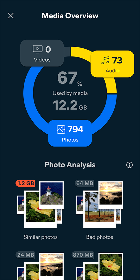 1、内存/缓存清理: RAM 内存进程识别并清理后台运行的不需要的已缓存 RAM 内存。 智能照片清理,清理您的照片收藏,轻松两步就能为更重要的内存腾出空间。自动识别不需要的照片和类似照片,只需点击一下,就可以找到您所有几乎重复的、暗色的,模糊或质量差的照片。 2、历史文件清理: 轻松清理您的浏览器、剪贴板、应用商店和电子邮件,查看并轻松清理超过 5 MB 的媒体文件和文档。 3、应用管理: 根据储存位置、RAM、耗电量 或 移动数据 使用来查看和移除应用程序。应用会根据最近一次使用时间接收每周顾问有关“很少使用的应用程序”的通知,您就可以选择想要保留和想要移除的应用程序。 通过强制停止耗用 RAM 的正运行应用程序,以完全停止其活动,包括后台进程和通知,直至您主动将其再次启动,以节约 RAM 空间,提升运行速度。 4、电池优化: 省电助手可以帮助您查看耗电项并轻松关掉不需要的项,从而为节约电量,提升设备续航能力。 电池配置文件可在车内、电量不足、家里、办公之间进行选择,当然您也可以手动添加自己的配置文件,让手机以您想要的方式运行。 5、自动清理、优化: 当您设置好自动清理工具和电池优化配置文件,AVG Cleaner 就会为您自动找到无用数据和垃圾内容并让您仅从您设备通知面板的一个提醒将其清理即可,一切就是这么简单。软件特色