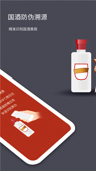 国酒NFC防伪溯源体系是于2013年5月22日正式推出,防伪芯片由一盘圆形电子线圈组成,安装在红胶帽封膜下,瓶盖顶部。每一芯片由贵州茅台酒在生产线上写入识别码,每瓶酒都与这些识别码一一对应,每瓶不同。消费者可以通过自带NFC功能的手机,安装茅台专用APP"国酒NFC防伪溯源"。打开APP后,按提示用手机背部贴近瓶盖,进行验证。APP通过收录全国海量流通商品信息,形成大数据基础比对库,有效辨别重码、错码等信息,能够快速识别假货。软件特色