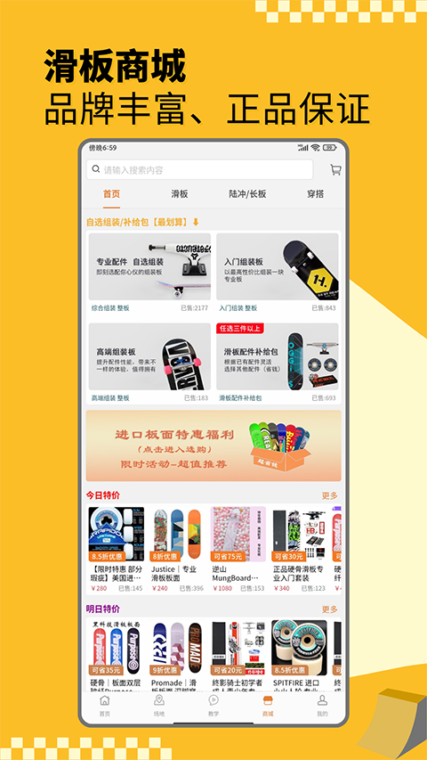1、在这里拥有丰富的滑板教学视频,随时随地都可以在线学习。 2、发现更多热爱滑板的小伙伴,让自己不再孤单一个人玩滑板。 3、提供最为专业的滑板技巧,得到更多优质的学习资源。 4、丰富的滑板商品类型,在线就可以快速的进行购买。 5、使用积分就可以兑换到优质的商品哦。 6、了解跟多的滑板资讯,让滑板运动可以变得非常的有趣。功能介绍