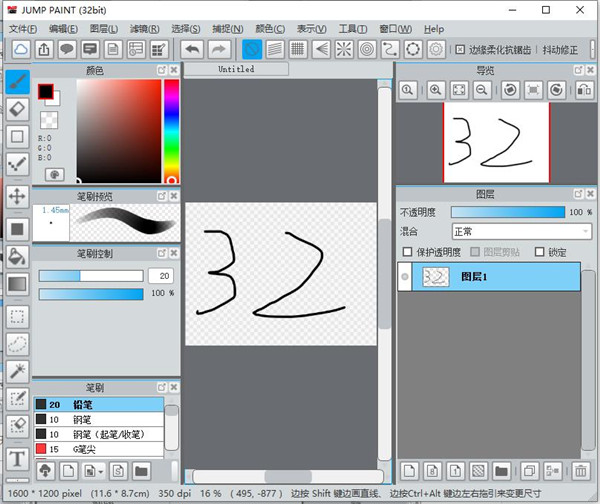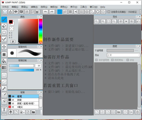 1、随心所欲的绘制编辑造型功能 2、具有丰富的色彩填充功能 3、256步的Undo、Redo功能 4、开放的素材库功能 5、基于模板的电子书自动生成功能 6、完备的帮助系统 7、支持使用图片自制笔刷JUMP PAINT使用方法