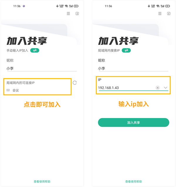 1、加入共享(自动加入/手动加入) 手机端也可通过局域网内自动搜索自动加入,也可手动输入IP搜索加入