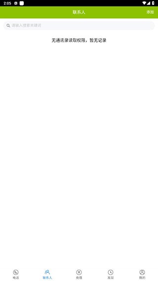 用户点击屏幕下方的电话图标,即可进入电话界面,会显示最近通话记录,也可以点击右边绿色图标打开键盘进行拨号。
