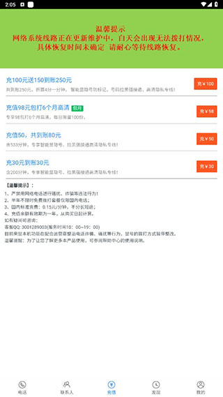 用户点击屏幕下方的充值图标,即可进入充值界面,用户可以选择充值档次,每一个档次送的话费都不一样,充的越多送的越多。