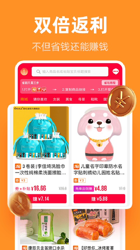 1、网购有返利 通过巨省钱优惠券去淘宝、京东、拼多多、唯品会、苏宁易购等商家购物,可以获得现金返利 2、点外卖有红包 通过巨省钱优惠券去“饿了么”,“美团”点外卖,可以获得外卖红包 3、优惠券搜索 巨省钱优惠券收录了淘宝、京东和拼多多等平台的优惠券,你可以简单快捷的搜索每一件商品的优惠券 4、出行有优惠 通过巨省钱优惠券去携程、滴滴出行、高德打车等平台预定酒店或者购买出行券,可以获得现金返还 5、新用户福利 在APP首页点击高佣金,购买对应商品后不仅全额返还,还可以赚取佣金 6、每日赚喵币 每天签到,买之前搜索优惠券,通过巨省钱优惠券点外卖,都可以获得喵币奖励,喵币可以当钱花,辅助你养成网购省钱的小习惯 7、一键分享 一键分享邀请微信、QQ好友,好友完成首单,还可以赚取红包奖励哦软件亮点