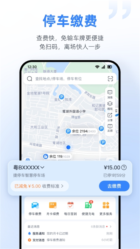 【场位查找】信息全面,更优选择; 【预约预订】提前选订,高效出行; 【在线支付】线上缴费,快速离场; 【月卡续费】在线续卡,省时省心; 【无感支付】先出后扣,无感通行; 【共享停车】错峰共享,停车有位; 【会员套餐】精打细算,尊享优惠。软件亮点