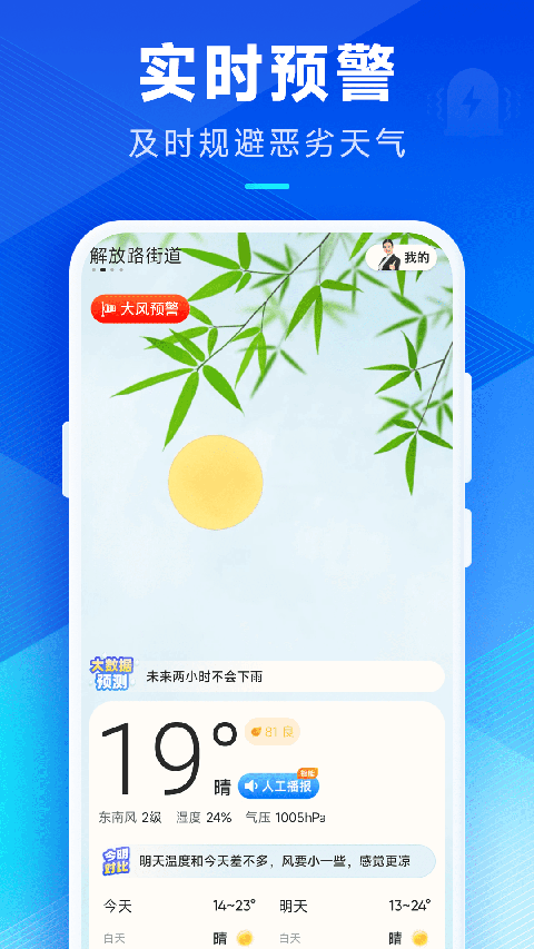 权威数据预报,雨落雨停早掌握 智能语音播报,生活出行好帮手 实时精准预报,提前规避坏天气 直观气温趋势,天气变化早知道