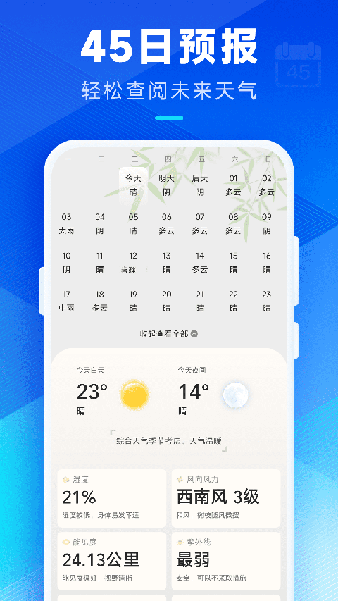 可预报未来45日的天气,并通过图表,清晰直观的看到有几天下雨、几天高温、几天低温、几次升温、几次降温创奇天气app特色