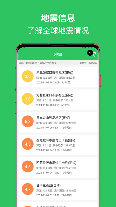 1、体验起来简单还方便,各种讯息都在上面了你可一定不要错过。 2、每天实时更新的,有多重查看模式。 3、实时查询全球范围内的地震讯息,了解最新的地震资讯。更新日志