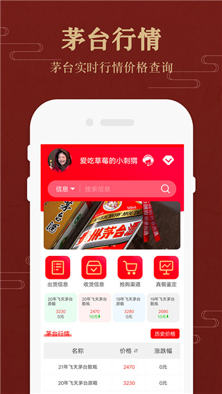 【飞天茅台市场价格】 提供飞天茅台53度最新市场价,通过散瓶、原箱、年份等维度,分别实时报价。报价价格来源于全国流通量最大的经销商内部调货和相互报价,价格公允、公平、及时,软件并提供历史价格及走势参考。为您出货、收货提供最及时的一手参考信息。 【真假鉴定】 本平台提供飞天茅台真假鉴定知识,精准识别茅台真假,快速辨别真伪。用户可以学习辨别真假茅台的技巧,避免上当受骗。 【茅台出货和收货】 用户可发布飞天茅台的出货、收货信息,平台为全国茅粉提供收购信息,促成双方交易,为大家提供方便。 【茅台抢购】 整理了市面所有的飞天茅台抢购信息,通过快速导航,方便用户参与预约、抢购。信息全面、权威、及时。用户能够快速识别JD、PDD、SUNING、youpin、guomei、tianmao等各大电商、商超、线下1499渠道信息,方便快速掌握并选择参与。功能介绍