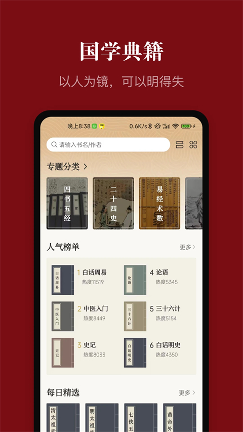 【中华历史全解析】从夏商周到元明清,朝代更迭、年表脉络、政治军事、大事件纪实一网打尽;收录「历史上的今天」「国别史专题」「成语典故」,配以高清历史地图与趣味知识点总结,让枯燥历史鲜活起来! 【古诗词文库】唐宋诗词、元曲经典、诗经楚辞全收录,支持按作者、朝代、主题检索,附赠赏析注释,助您深度领悟诗词之美。 【 国学经典宝库】四书五经、二十四史、历代演义等经史子集在线阅读,配合职官辞典、文言文字典工具,破解古籍阅读难题,零基础也能轻松读懂国学经典。 【 学习备考助手】初中高中历史知识点系统梳理,历史大事件时间轴清晰呈现,助力学生高效备考,提升文化素养。 【体验升级】无广告纯净阅读,随时随地畅游文史海洋软件功能