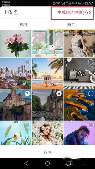 4、第四步选择要生成视频的图片,点击右上方的“生成照片电影”,需要注意的是选择照片要大于1张,如下图所示