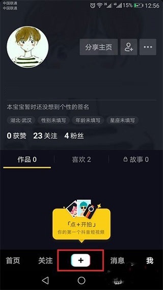 1、打开抖音,点击中间的+进行拍摄视频,如下图所示: