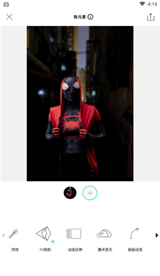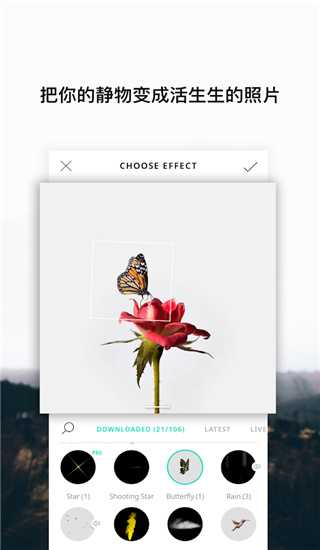 1、全新打造的编辑界面:在诸多特效和动画图层间不断切换实在是一件痛苦的事情,新的界面布局将变得更简便易用! 2、用新的文本工具来讲述你的故事。可以在图像中添加自定义文字了。 3、单张照片可支持添加多达10个不同的特效、滤镜或动画部件。 4、选择流动或拉伸动画来为你的照片加赋动感! 5、每个特效都有独立的色度、明暗度、对比度可供调节,使你的作品看起来更加真实和谐。