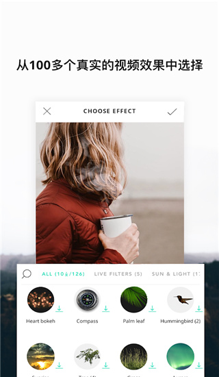 2、选择一个你喜欢的效果,你认为适合你的图片的效果。目前,我们有超过100个内置效果,我们不断添加新的效果至应用程序。
