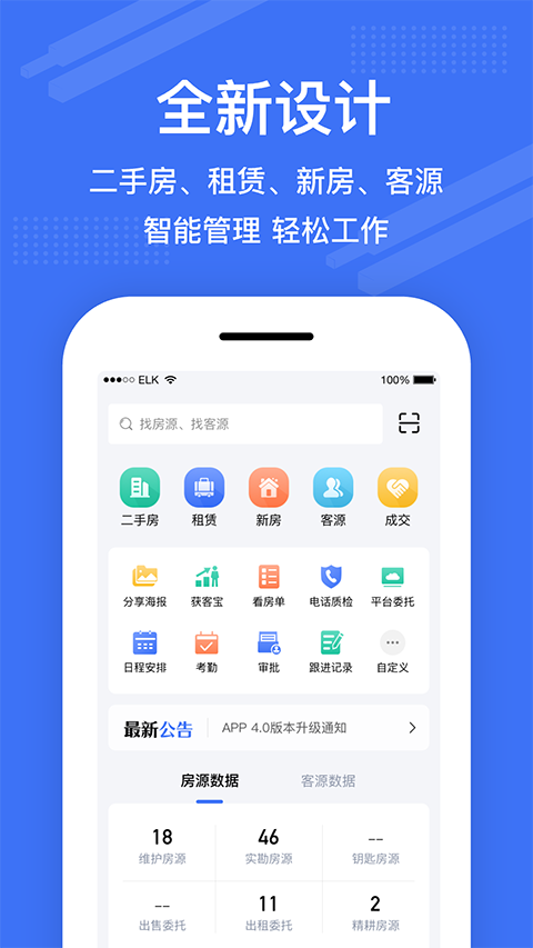 包含:楼盘字典、房源管理、客源管理、电子合同及权证过户管理、新房管理、任务管理、考勤管理、人员管理、组织架构、财务管理、统计分析、情报中心、隐私电话、OA办公、VR/视频看房、一键同步、网站、企业小程序等。更新日志