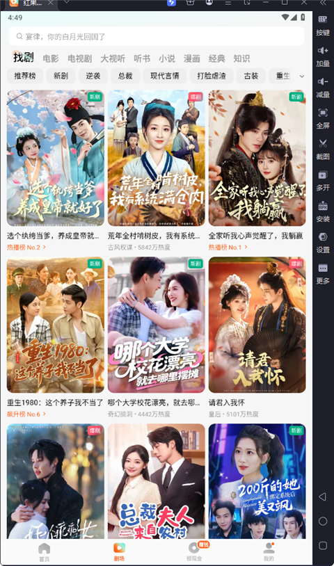 红果免费短剧电脑版是一款依托模拟器运行的免费短剧平台,它不仅提供海量短剧资源,还内置电视剧、小说、漫画、电影等板块,你可以在这里免费观看各种热门题材的短剧、电视剧资源,点击即可观看,无广告,为用户提供多元化的免费娱乐选择!红果免费短剧内的资源全为高清,不管是短剧还是漫画都是非常清晰且极其流畅,漫画、小说、有声书、电子书资源还支持下载离线阅读!