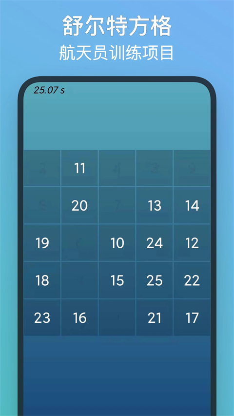 1、标准5x5舒尔特方格注意力训练法 2、3x3阶到9x9,随你挑战 3、难度增加,更刺激 4、据说只有高手才敢玩 5、a-z,A-Z,a-Z等模式 6、注意力训练交流、学习交流的社区软件功能
