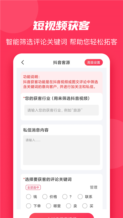 1、群发大师 图文群发、视频群发、智能群发……自定义关键词,丰富群发模板,AI智能微信群发,分批发送,无论您想怎么群发,我们都尽力帮您实现。 2、客源大师 微信扫码加人,批量好友添加,抖音、快手、小红书、企查查多渠道智能标签筛选,评论获客引流,精准客源即刻掌握。更有BOSS直聘小助理,轻松打招呼招人。 3、信息大师 未读消息一键处理,微信信息快捷回复,微信好友标签便捷管理,智能分析好友报告,轻松查找非好友,让微商更加了解客户资源。 4、群聊大师 拉一人进多群,拉多人进一群,批量退群,批量群公告,帮助微商用户减少繁琐操作步骤,加快成单效率。微粉大师软件如何设置消息群发