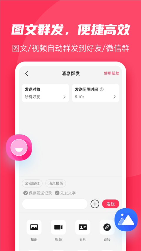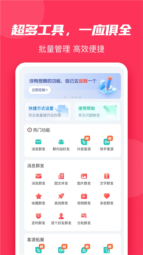 1、爆粉领域满足需求 客源拓展工具超快吸粉,精准客源自动找上门,高质量用户百分百活粉,发展自己的粉丝经济,多种加粉模式,让好友快速加爆你的通讯录。 2、群发功能完整高效 一键自动群发图文消息、亲密群发、群发公众号、群发小程序、群发微信群,专业开发工程师团队精心优化算法,只为每一次群发都更加稳定快速。 3、僵尸粉检测速更高 自动检测已经删除或拉黑了你的好友,对其他好友无打扰,无风险,支持一键备注和一键删除,释放你的双手。 4、全智能个性化制图 支持图片水印、文字水印、自定义水印,个性化图片制作,每一张图都是您的私人订制。更新日志