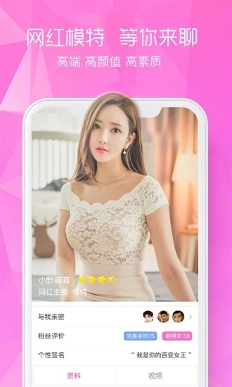 同城约会:同城约撸串,酒后助安眠,不撩播,现实交友随时约会起来。 无限畅聊:一起遇见缘分,想谈恋爱。 随机交友:聊天交友,经营属于你们俩人的爱情故事。 原创小视频 :一起用相机录制短视频记录生活的点点滴滴,有好看视频,分享给朋友,秀出更美的你! 拒绝没有温度的语音文字聊天。推荐优质主播,多角度来认识你心仪的高颜值社交女生,总有让你小鹿乱跳的心动款。所有的主播都通过严格的人工真人认证,让你遇见真正有趣的人,美美聊一次!软件优势