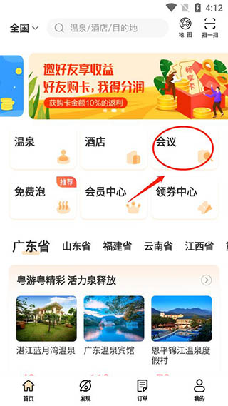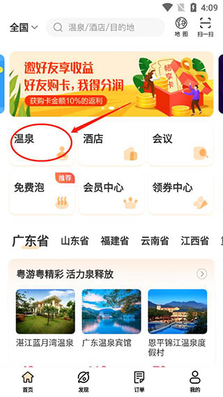 一、预订温泉 1、打开软件,首页点击温泉按钮;