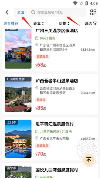 2、接着选择预定地区,在搜索栏搜索温泉名;