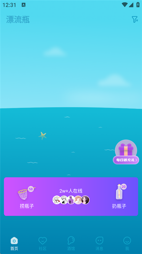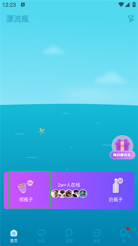 1、打开正宗漂流瓶app,在首页点击捞瓶子。